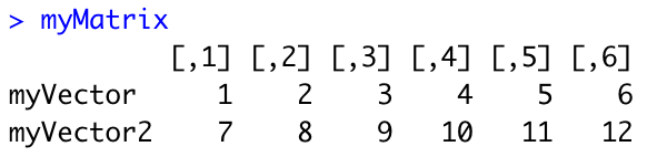 myVector2 <- c(7, 8, 9, 10, 11, 12)
